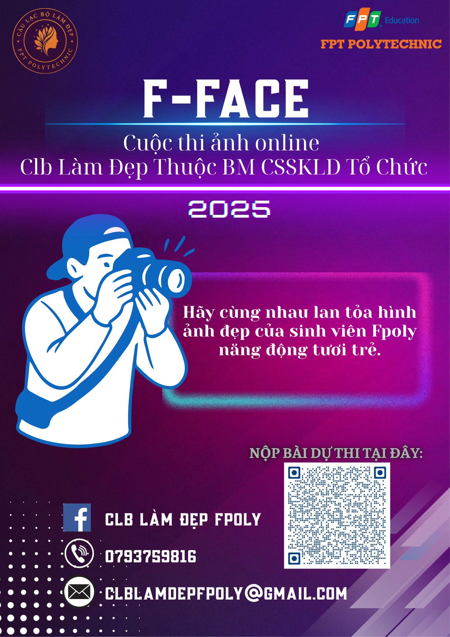 Nhằm chào mừng sự ra đời của CLB Làm Đẹp trực thuộc bộ môn CSSKLD (Chăm sóc sức khỏe & Làm đẹp), đồng thời tạo sân chơi gắn kết và lan tỏa tinh thần trẻ trung, năng động của sinh viên FPT Polytechnic, cuộc thi ảnh online mang tên F-FACE chính thức được phát động từ ngày 3/10/2025.