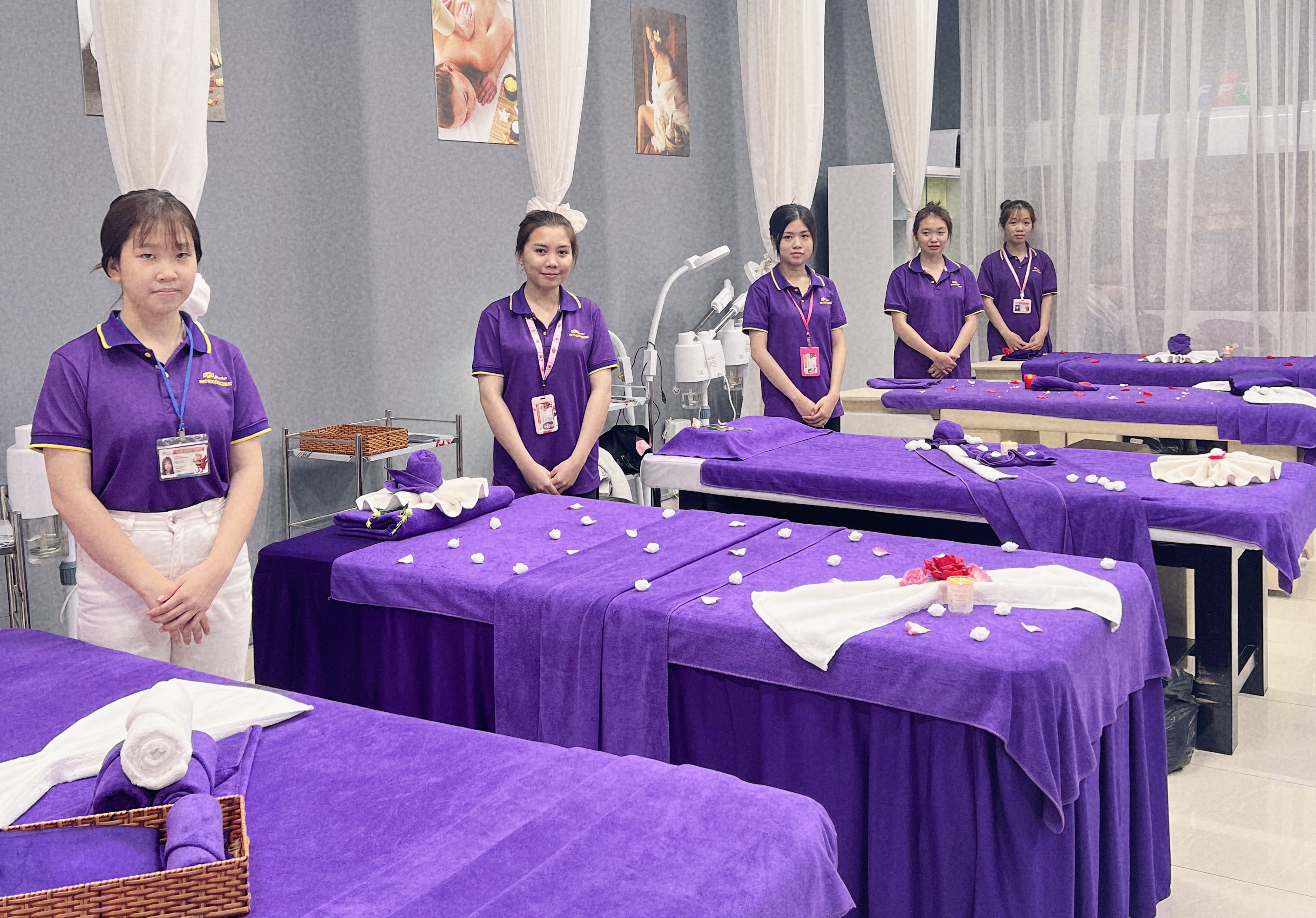Điều khiến nhiều học viên bất ngờ ngay từ ngày đầu chính là môi trường học tập. Phòng học được thiết kế hiện đại, mô phỏng không gian spa thực thụ với giường massage, ánh sáng dịu và hương tinh dầu dễ chịu. Nhờ đó, mỗi buổi thực hành đều mang lại cảm giác như đang làm việc trong một spa chuyên nghiệp, giúp học viên tự tin hơn khi bước vào nghề.