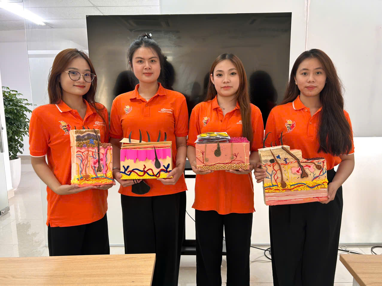 Trong tiết học “Nhập môn về cấu tạo da”, cô giáo đã giúp các bạn sinh viên hiểu rõ từng lớp cấu trúc của da: Thượng bì – Trung bì – Hạ bì, cùng chức năng và vai trò của từng thành phần trong việc bảo vệ, nuôi dưỡng và duy trì sức khỏe làn da. Tuy nhiên, điều khiến buổi học trở nên thật đặc biệt chính là cách giảng dạy đầy sáng tạo – “học qua trải nghiệm”.